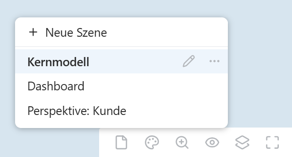 Mit Szenen kannst du dein Modell in mehrere visuell getrennte Bereiche aufteilen. In jedem Bereich kannst du eigene Elemente und Beziehungen setzen, Texte platzieren und Medien einbetten.