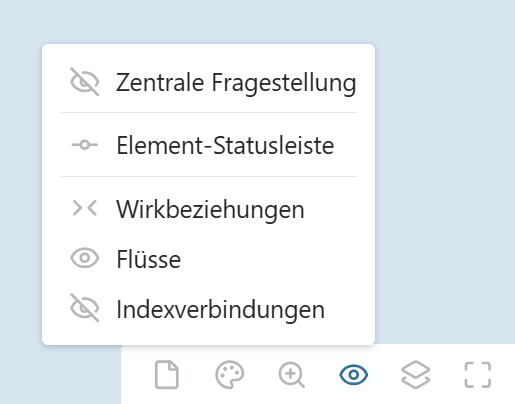 Wähle aus, was in der Szene zu sehen ist: Beziehungen, Flüsse, Index-Verbindungen, Fragestellung, … - Ebenen