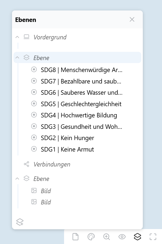 Standard-Szene, darin liegen alle Objekte des Netzes: Elemente, Texte, Formen, Diagramme, Bilder. Du kannst die Anzeigereihenfolge deiner Objekte hier verändern, indem du sie mit Drag&Drop sortierst. Einträge, die weiter oben in der Liste liegen, werden weiter vorne im Arbeitsbereich angezeigt. - Verbindungsebene