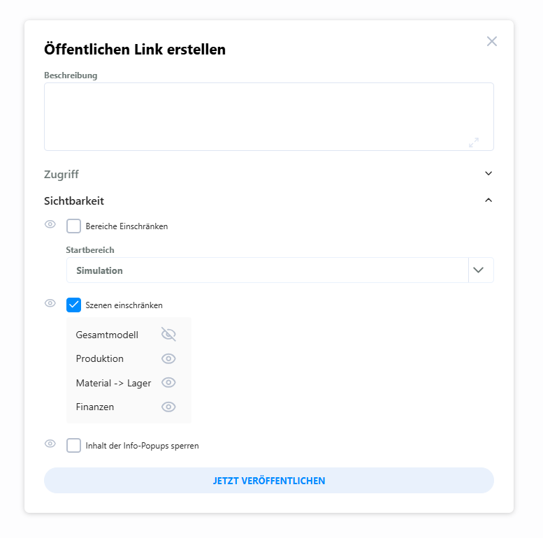 🔒 Szenen sind ein Pro-Feature und sind nur mit einem bezahlten simcision Abonnement verfügbar. Zusätzlich ist das Upgrade „Konfiguration Öffentlicher Links“ nötig, um die Sichtbarkeitseinstellungen bei Veröffentlichungen zur Verfügung zu haben.
