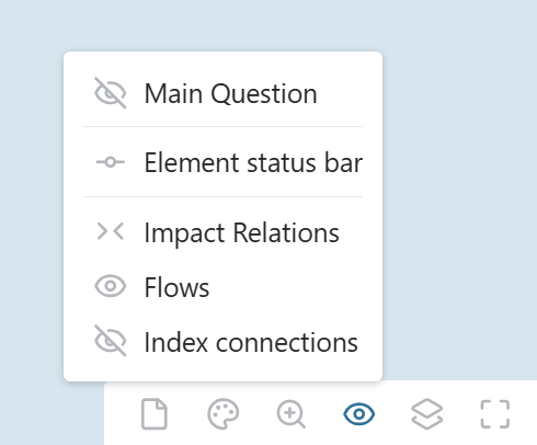 In the scene visibility menu, you can define what is visible in the current scene. You can show or hide connections, display or hide the central guiding question, and control what information is shown inside elements.